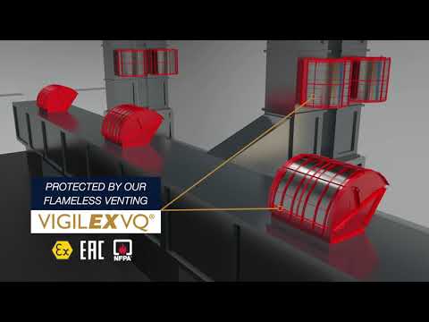 To protect indoor machinery the Vigilex VQ guarantees flameless venting and dust protection. No burnt or unburnt dust passes off. Even high temperature is reduced to a minimum. During normal venting an explosion is freely discharged, allowing flames and dust to exit from the process vessel. When the process is located indoors, ducts are generally used to convey the explosion outside the building.