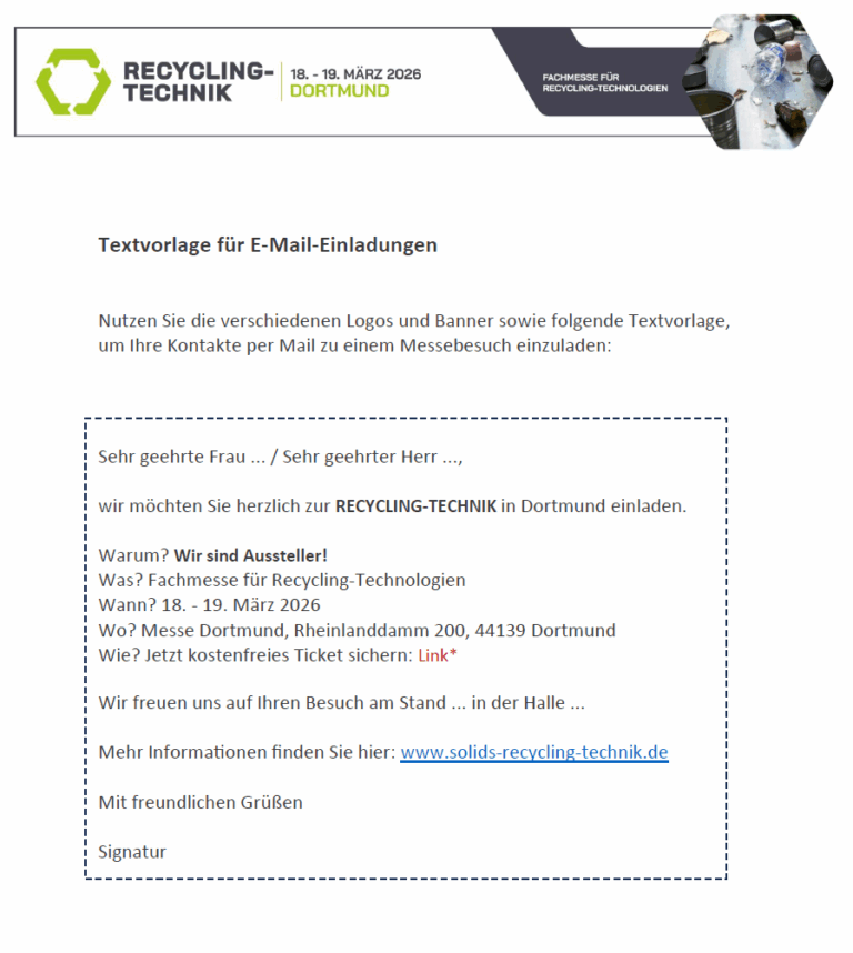 Informieren Sie Ihre Kunden über Ihre Messeteilnahme an der RECYCLING-TECHNIK Dortmund. Nutzen Sie unser kostenfreies Marketing-Material wie das Logo oder das Online-Banner in Ihren E-Mails, auf Ihrer Website oder verknüpfen Sie Ihre Homepage direkt mit www.solids-dortmund.de.
