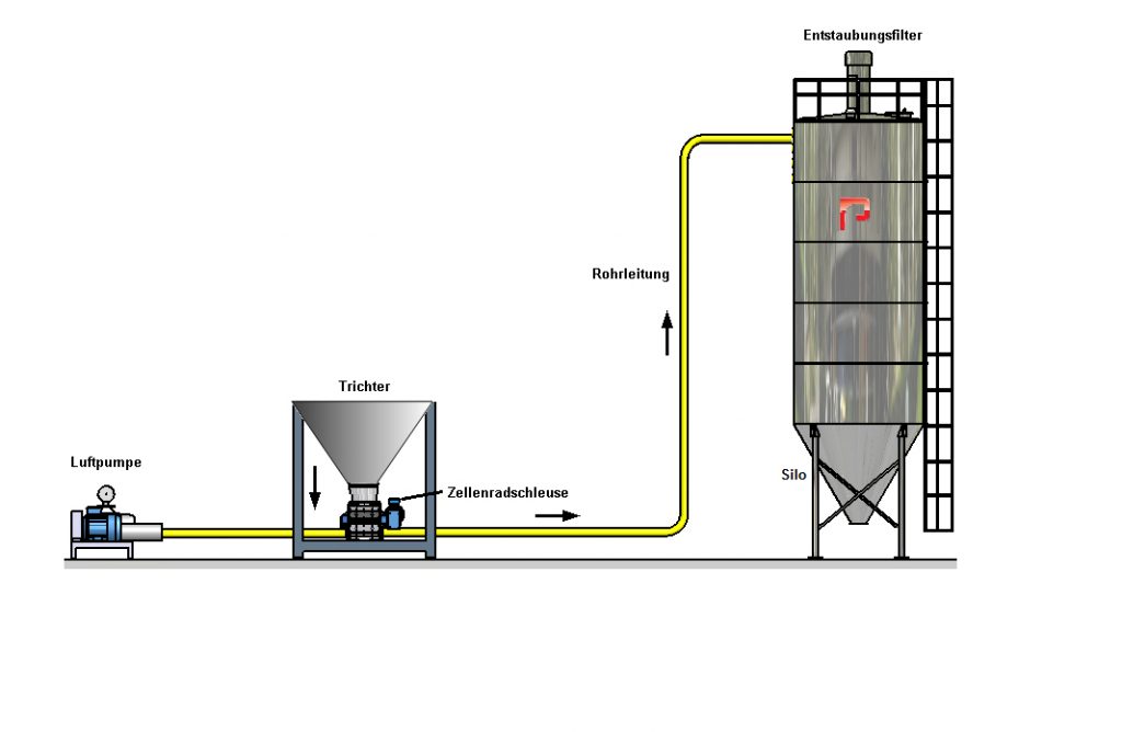 Funktionsweise: Das Schüttgut wird über eine Schleuse (meist eine Zellenradschleuse) in das unter Druck stehende Rohrsystem eingebracht. Der durch Kompressoren oder Gebläse erzeugte Überdruck treibt das Material-Luft-Gemisch durch die Rohrleitung bis zum Zielort, wo es abgeschieden wird.